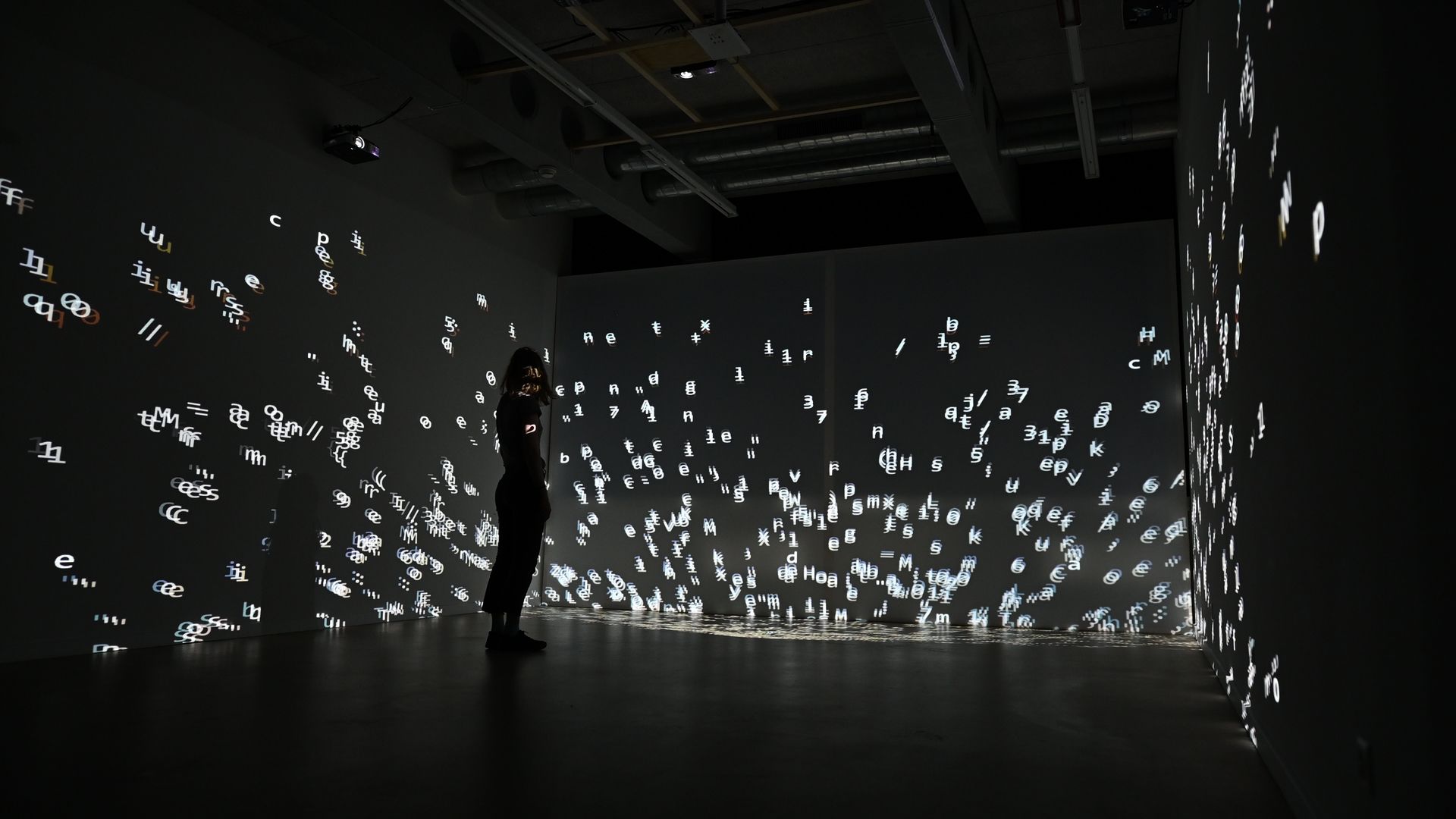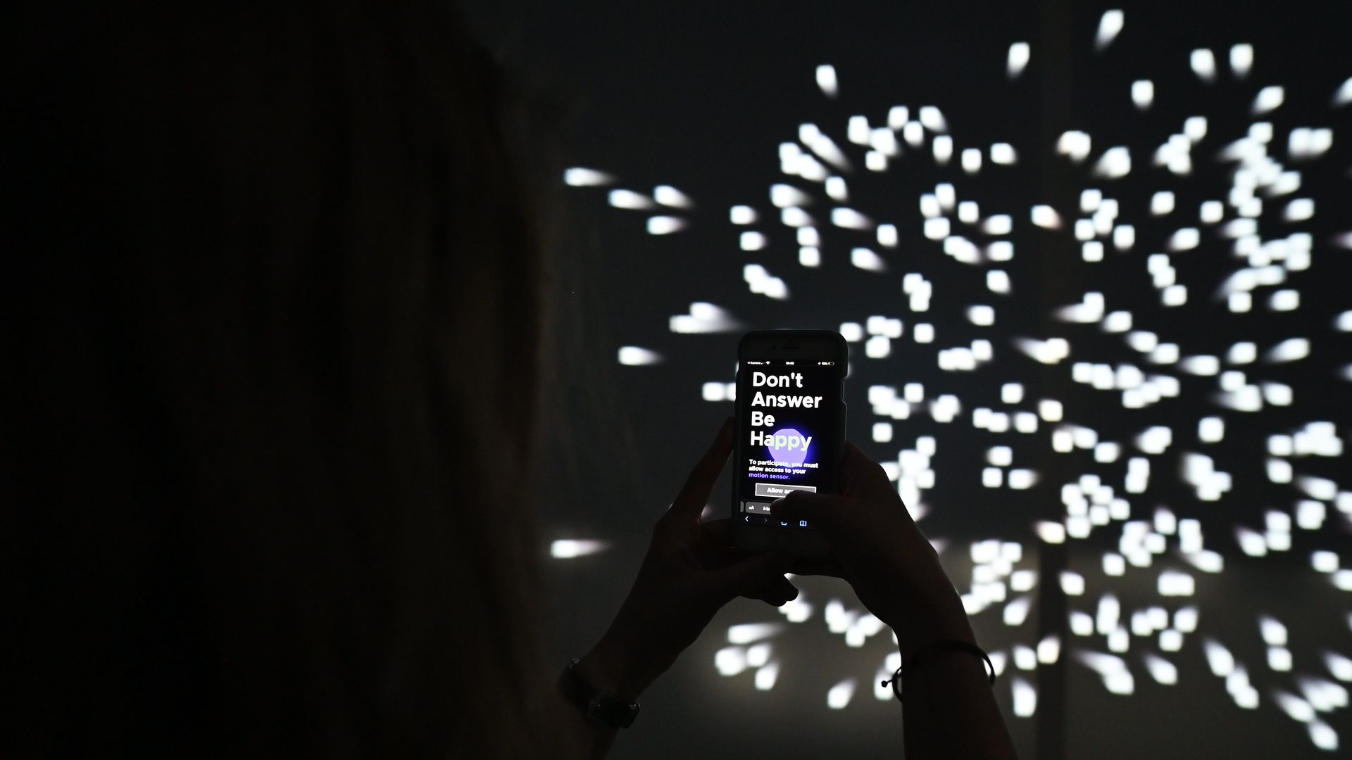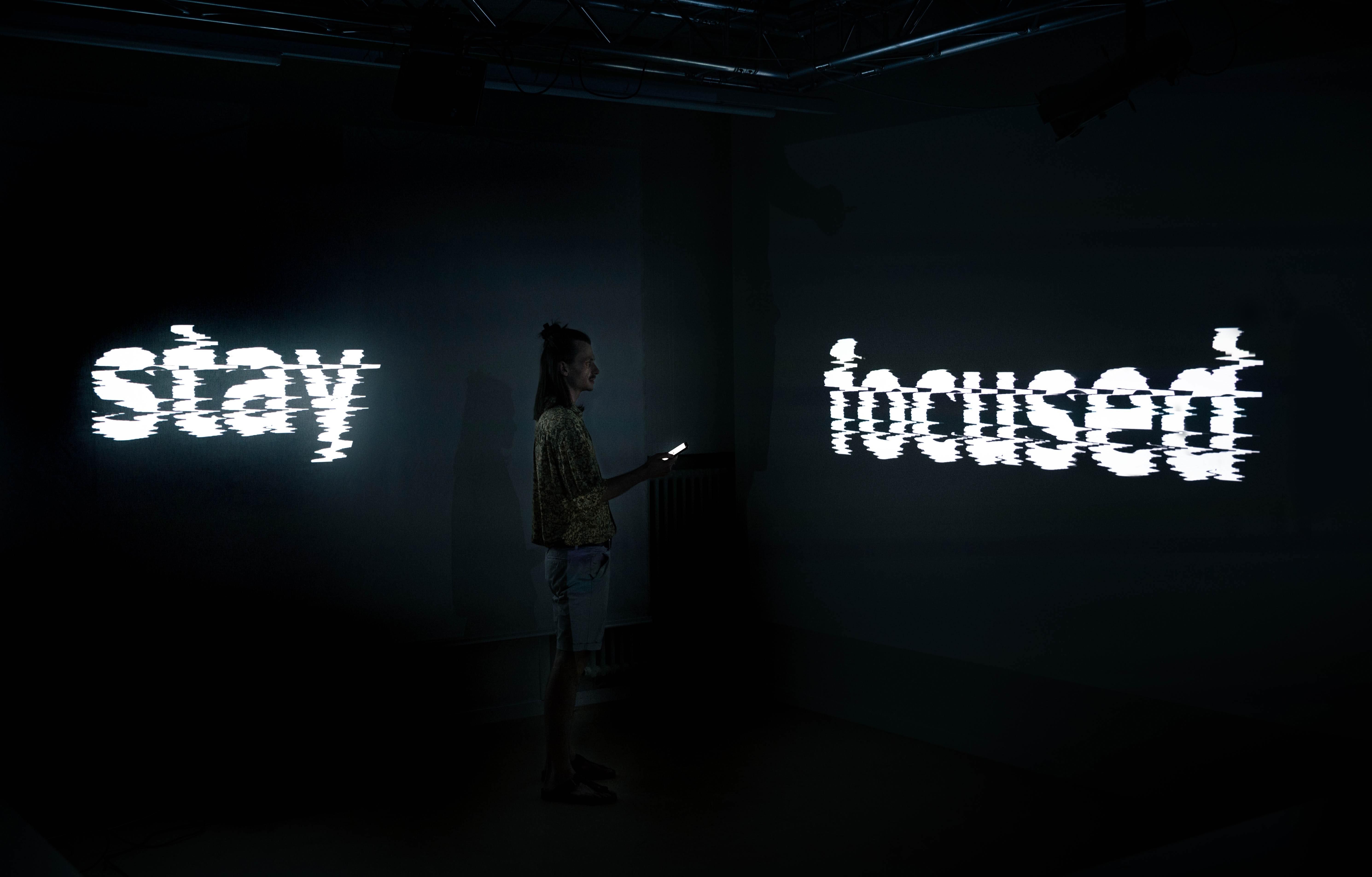 The smartphone as the focal point of the different conflicts is also the interactive element. A new type of interaction was specifically developed for this installation, based on gyroscope data of the smartphone, which is accessed via a web application. All visual and auditory experiences in the space are based on the rotation of the smartphone. The visitor also provides answers to the questions by pointing the smartphone at different projections, resulting in an immersive experience.