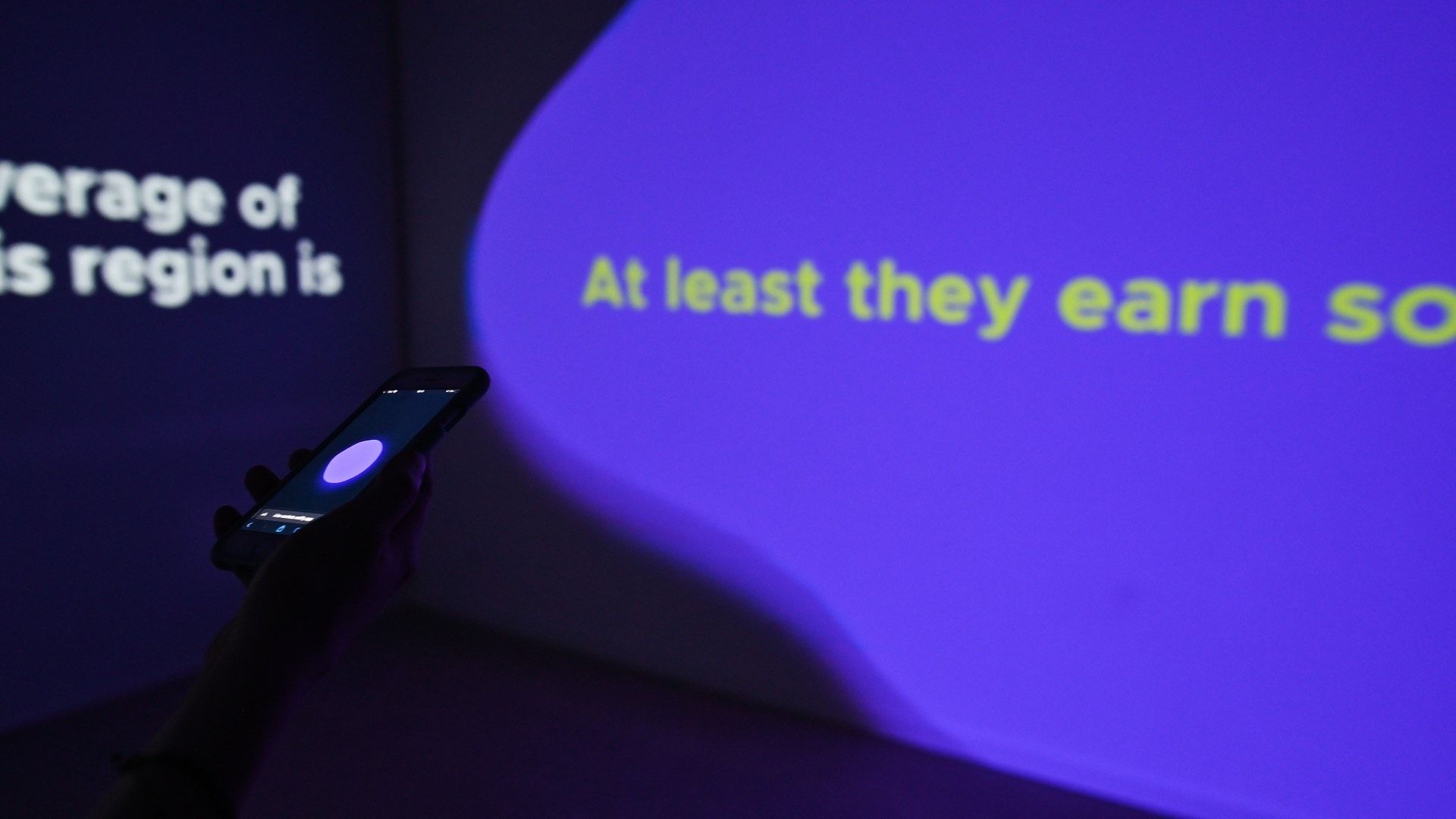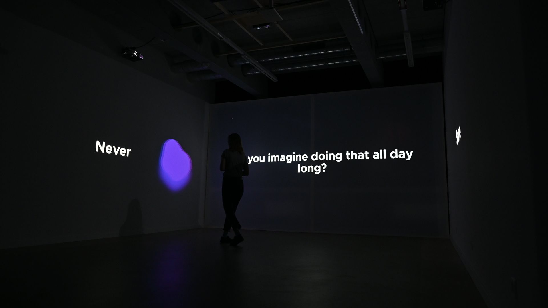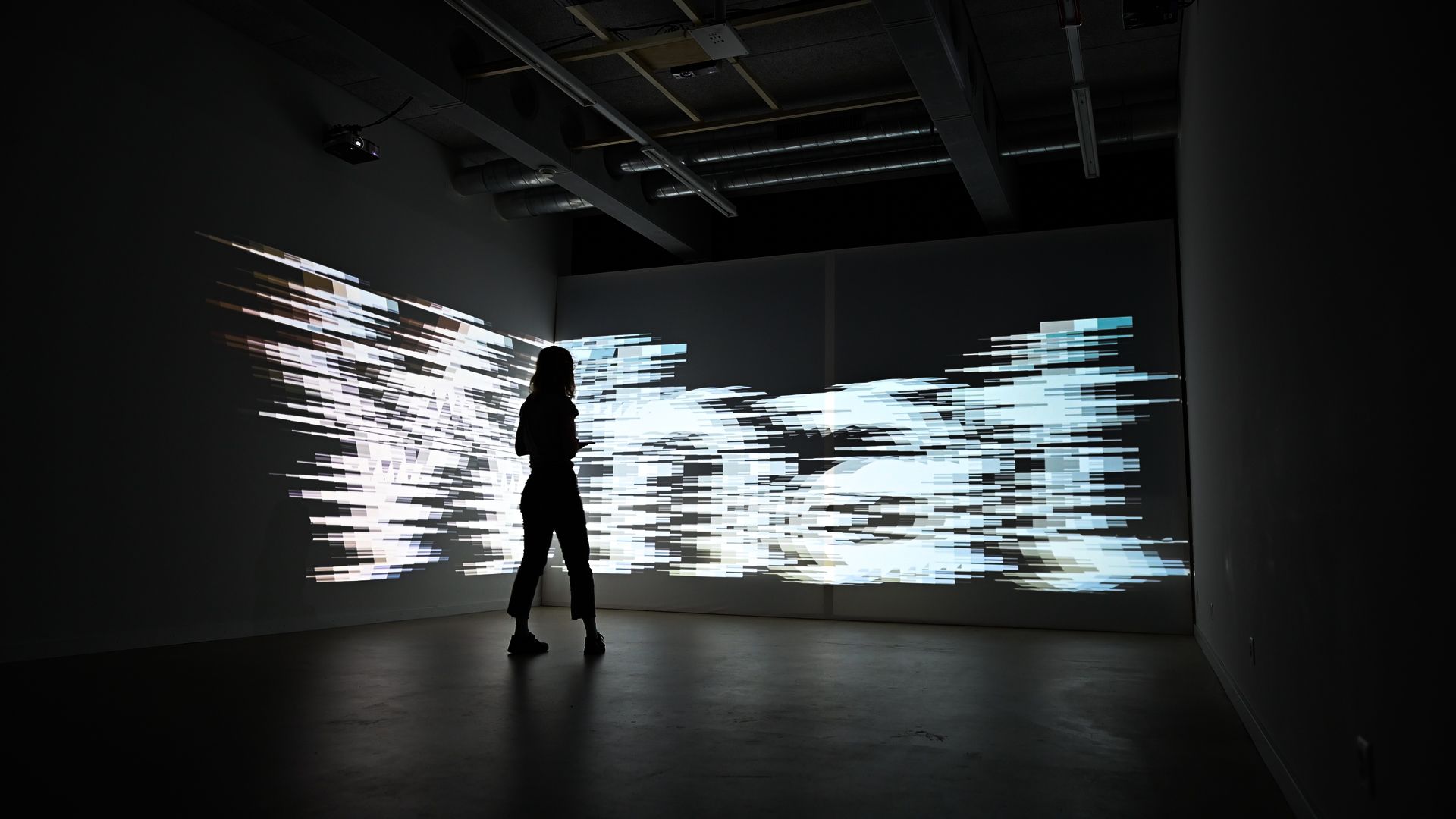 The smartphone as the focal point of the different conflicts is also the interactive element. A new type of interaction was specifically developed for this installation, based on gyroscope data of the smartphone, which is accessed via a web application. All visual and auditory experiences in the space are based on the rotation of the smartphone. The visitor also provides answers to the questions by pointing the smartphone at different projections, resulting in an immersive experience.