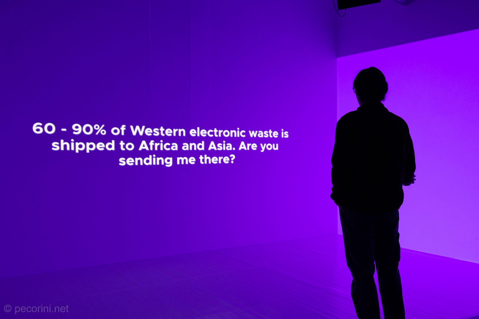 Conceptually the installation addresses the discourse of globalized technology and peeks behind the curtain of the hype surrounding artificial intelligence. In essence, it's about how technological developments have an impact on our society and what this means for different regions and peoples of this world. Many tech solutions that have become indispensable in the global North and which we have become accustomed to, can only exist through the systematic exploitation of the global South. Without the major discrepancy in income and living conditions, we would not be able to live out this (in our case) tech luxury to this extent. The installation Don't Answer Be Happy focuses on the people who make Western tech luxury possible in the first place through their daily work in precarious conditions, be it clickwork in the creation of datasets that serve as the basis for AI algorithms, in content moderation, in the production of electronic devices or in their recycling. In the Congo, people are exploited to extract gold and cobalt for our smartphones. In China, workers have to assemble electronic devices which they could never afford due to non livable wages. In order for us to use social media without images of violence and abuse, people have to categorize images of violence, racism, and sexual assault every day. AI systems are only highly "intelligent" because they have been trained by thousands of clickworkers in India. However for us living in the global North, this side of digital reality is not largely visible.