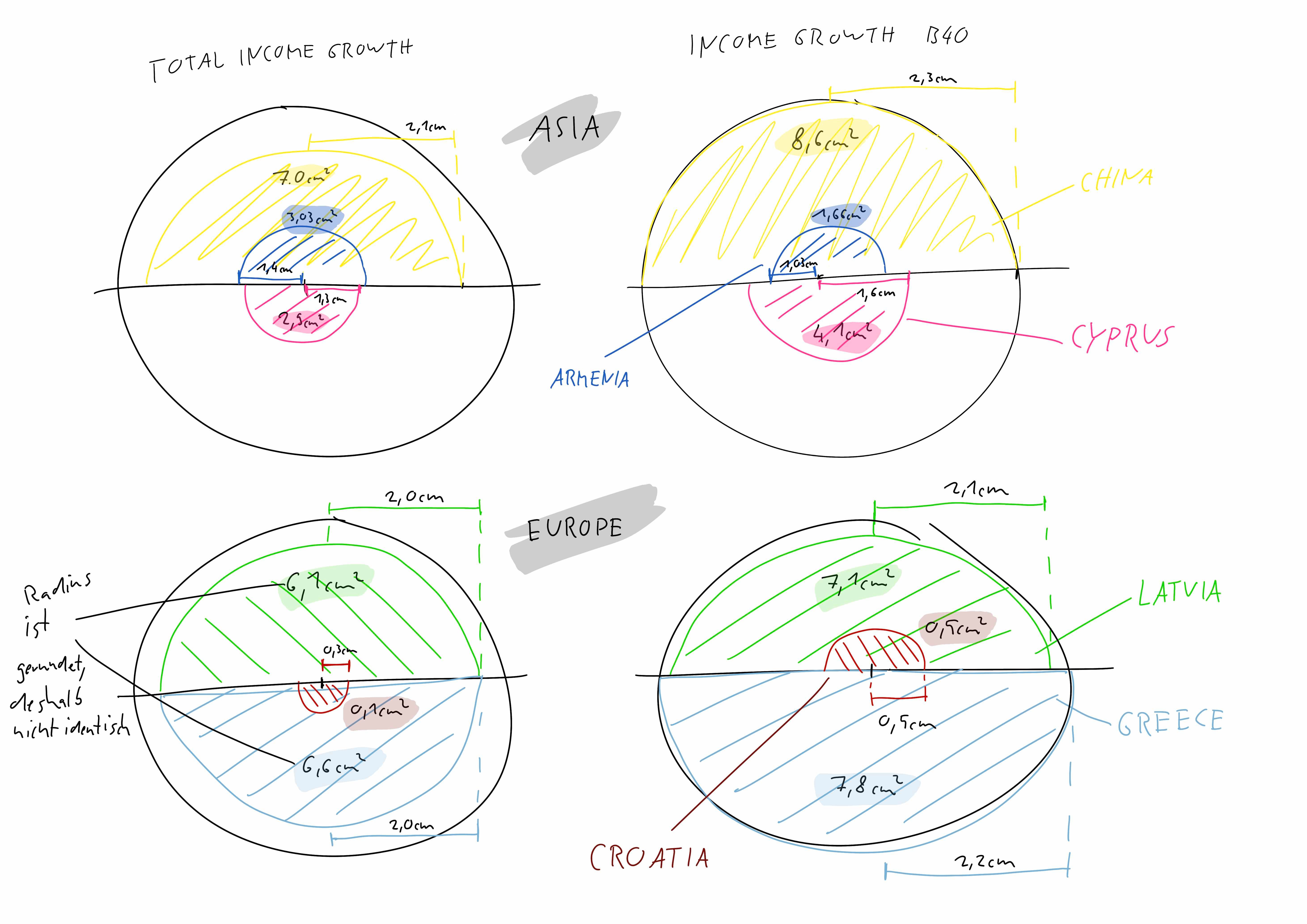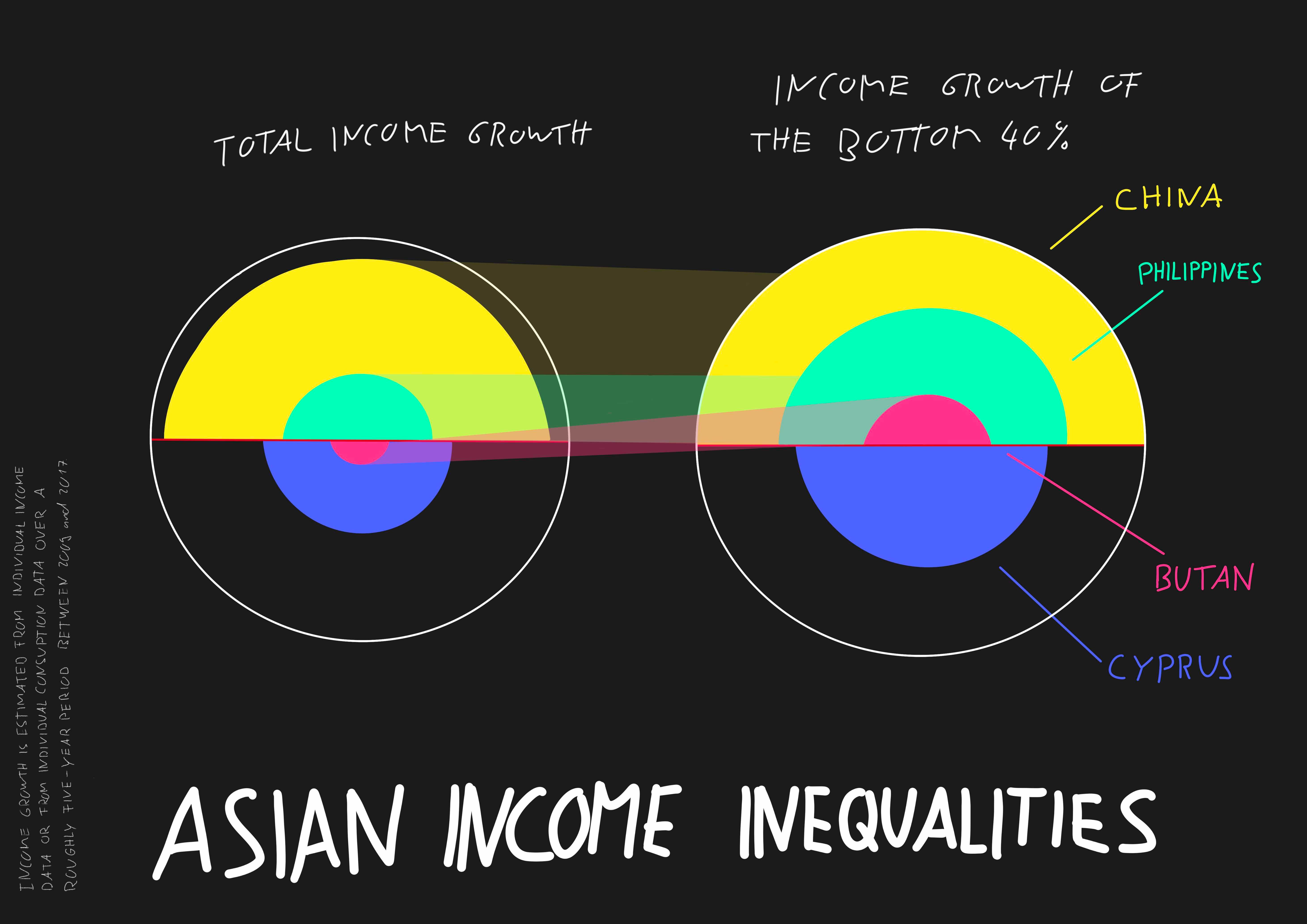 This chart compares four countries on each continent. The right-hand circle of each continent shows the growth rates of the bottom 40 percent of the population and the left-hand circle shows the growth of the total population. Income growth is estimated using individual income data or individual consumption data over a period of about five years between 2009 and 2017.