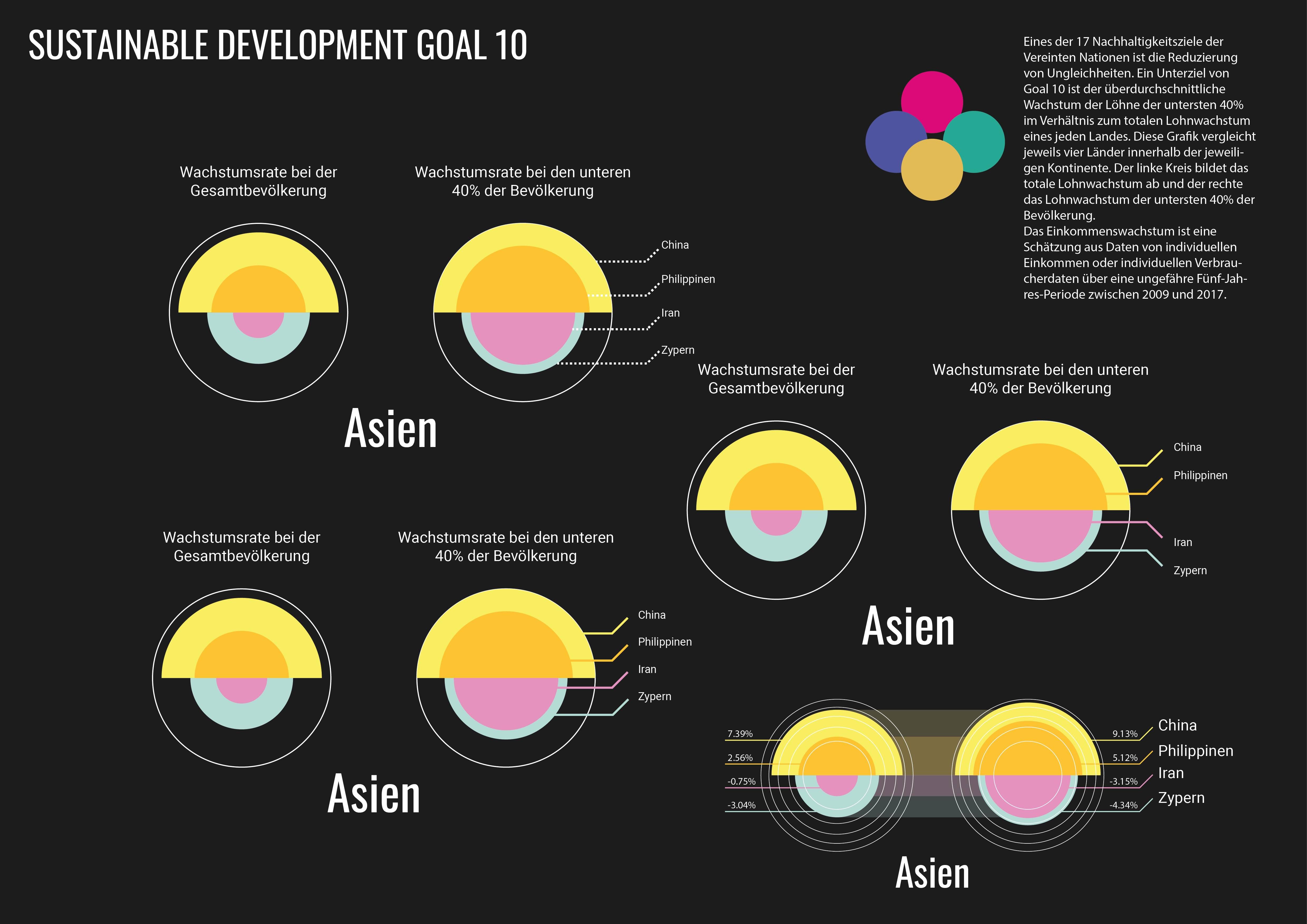 The 17 Sustainable Development Goals of the United Nations are a call to action for all countries and put the fight against poverty and inequality as well as for sustainable development and environmental protection on the same agenda. For this project, I chose goal number 10 with the main Goal of reducing inequality within and among countries and created a visualization for it. I experimented with different techniques until I found a way to represent the inequalities mentioned in Goal 10. One of the United Nations' "17 Sustainable Development Goals" is to reduce inequality, numbered as Goal 10.